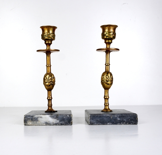 LICHTARZE, para. Dwa lichtarze mosiężne na kamiennych stopach z przełomu XIX/XX w.