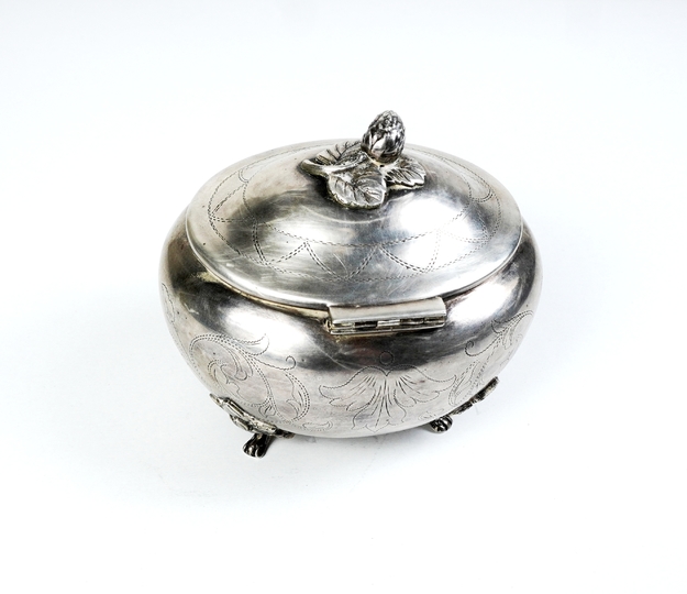 CUKIERNICA z motywami roślinnymi i truskawką na wieku, zapewne wyrób francuski.
