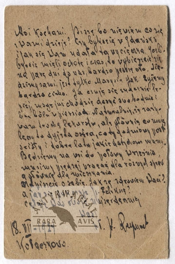 [REYMONT Władysław Stanisław]. Karta korespondencyjna z odręcznym listem Władysława Stanisława Reymonta do Wacławy (swojej siostry) i Feliksa (jej męża) Waldauów w Warszawie, dat. 18 VII 1924 w Kołaczkowie.