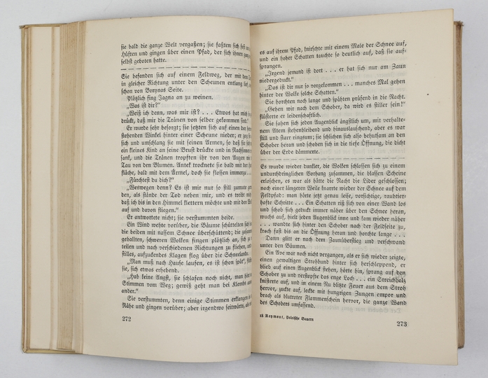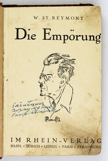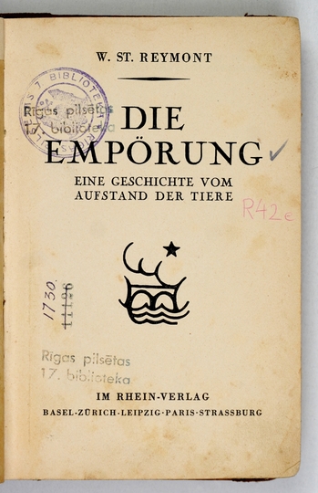 REYMONT W. St. – Die Empörung. Eine Geschichte vom Austand der Tiere. Einzig berechtigte Übertragung aus dem Polnischen von Jean Paul d'Ardeschah. Zweite Aufl. Basel [1927]. Im Rhein-Verlag. 16d, s. 297, [2]. opr. bibliot. ppł. z epoki z zach. okł. brosz.