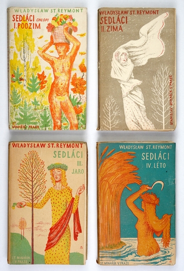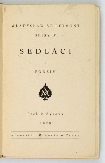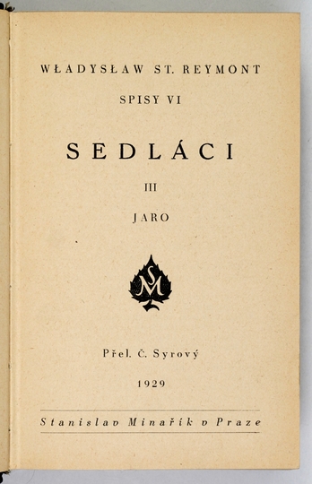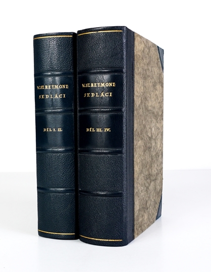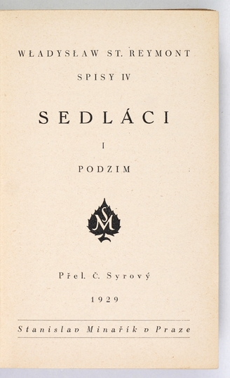 REYMONT Władysław St. – Sedlaci. T. 1-4 (w 2 wol.). Přel. C. Syrový. Praha 1929. Stanislav Minařik. 16d, s. 291, [1]; 323, [1]; 400, [1]; 329, [2]. opr. w 2 wol. psk. z epoki, górne obcięcie złoc.