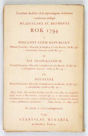 REYMONT Władysław St. – Sedlaci. T. 1-4. Přel. C. Syrový. Praha 1929. Stanislav Minařik. 16d, s.291, [1]; 323, [1]; 400, [1]; 329, [2]. brosz.