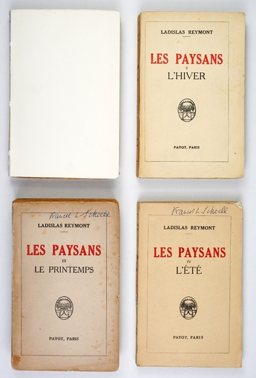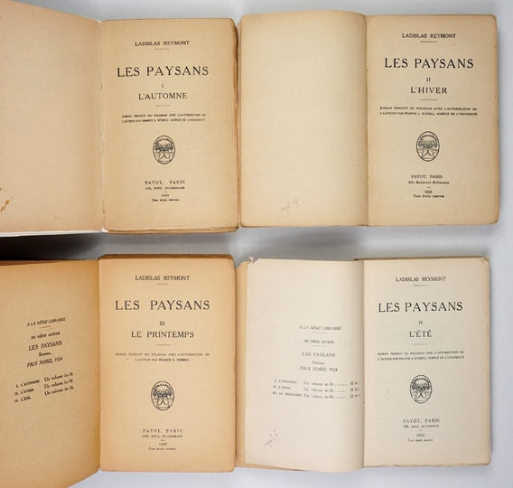 REYMONT Ladislas – Les paysans. Roman traduit du Polonais avec l'autorisation de l'auteur par Franck L. Schoell agrégé de l'Université. [T.] 1-4. Paris 1926-1938. Payot. 16d,s . 368; 400; 467, [9]; 389, [2]. brosz.