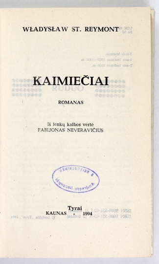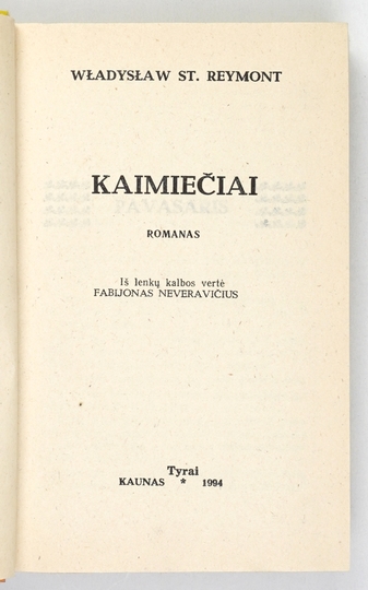 REYMONT Władysław St. – Kaimiečiai. Romanas. Iš lenku kalbos verté Fabijonas Neveravičius. T. 1-2. Kaunas 1994. Tyrai. 8, s. 581, [3]; 699, [4]. opr. oryg. kart.