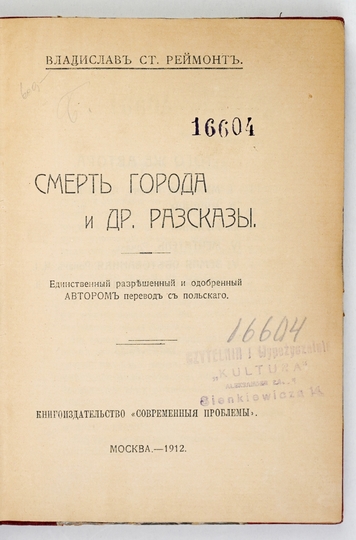 REJMONT Vladislav St. – Smert goroda i dr. razskazy. Edinstvennyj razrešennyj i odobrennyj avtorom perevod s polskago. Moskva 1912. Knigoizdatelstvo "Sovremennyja Problemy". 16d, s. 291, [2]. opr. bibliot. ppł. z epoki.