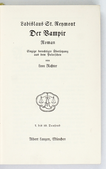 REYMONT Ladislaus St. – Der Vampir. Roman. Einzige berechtigte Übersetzung aus dem Polnischen von Leon Richter. München [cop. 1914]. A. Langen. 16d, s. 318. opr. oryg. pł. zdob. z zach. okł. brosz.