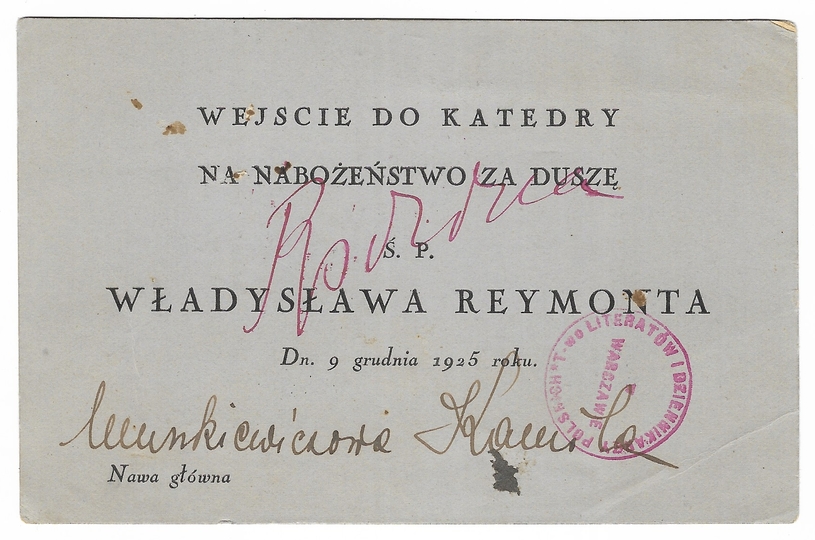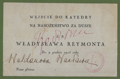 KARTA wstępu do warszawskiej katedry na nabożeństwo za duszę ś.p. W. Reymonta (zmarłego 5 XII) dn. 9 XII 1925 wydana Kamili Munkiewiczowej, siostrze pisarza.
