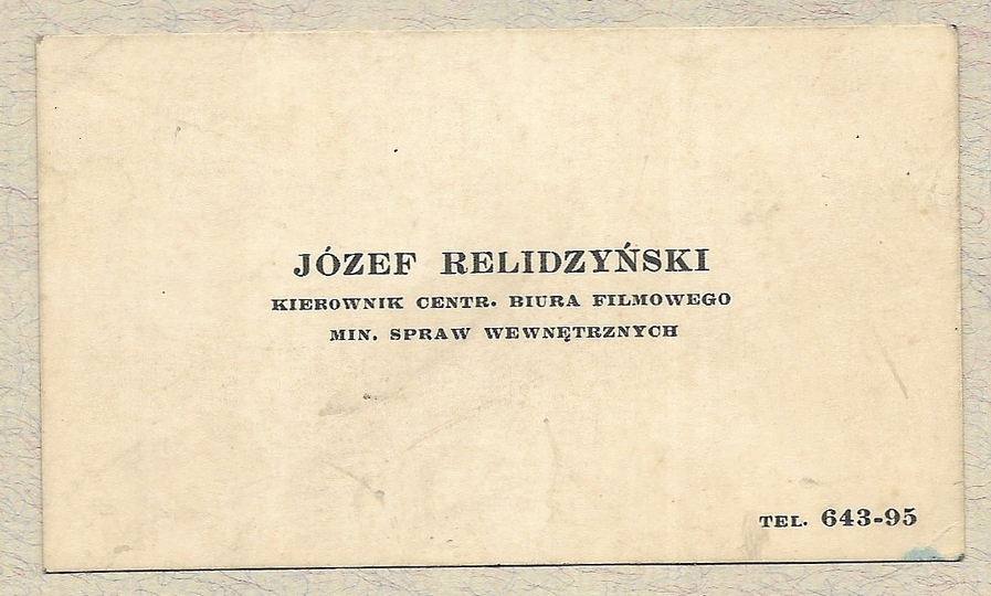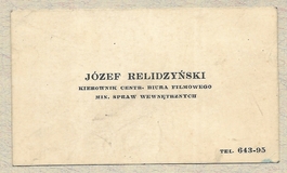 [WIZYTÓWKA]. Józef Relidzyński. Kierownik Centr. Biura Filmowego, Min. Spraw Wewnętrznych.