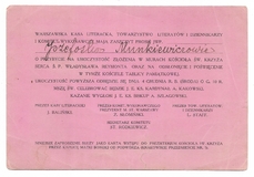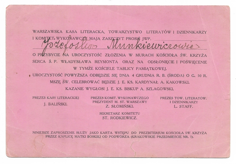ZAPROSZENIE na uroczystość złożenia serca W. S. Reymonta w murach kościoła św. Krzyża w Warszawie dn. 4 XII 1929, wydane Józefostwu Munkiewiczom (siostrze i szwagrowi pisarza).