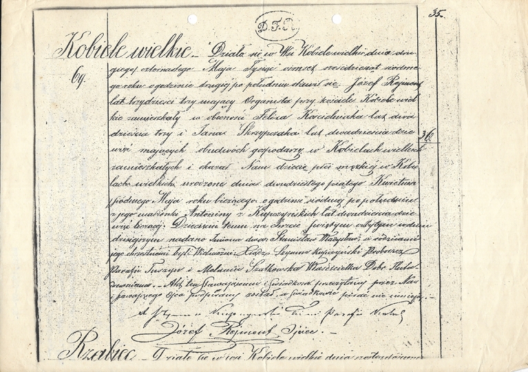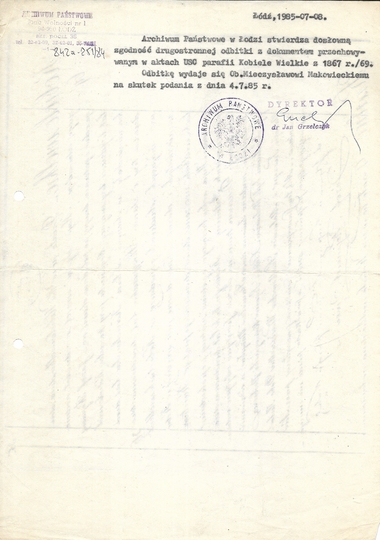 [AKT urodzenia W. S. Reymonta - kopia]. Uwierzytelniona kopia aktu urodzenia i chrztu Władysława Stanisława Reymonta z 2 (14) V 1867.