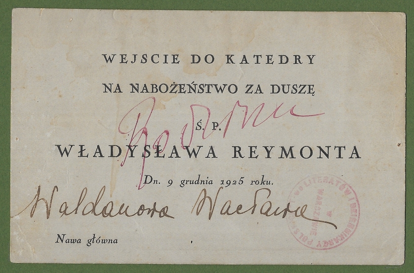 KARTA wstępu do warszawskiej katedry na nabożeństwo za duszę ś.p. W. Reymonta (zmarłego 5 XII) dn. 9 XII 1925 wydana Wacławie Waldauowej, siostrze pisarza.
