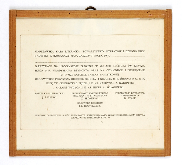 ZAPROSZENIE na uroczystość złożenia serca W. S. Reymonta w murach kościoła św. Krzyża w Warszawie dn. 4 XII 1929.