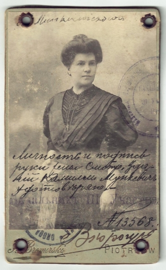 Kamila Julia z Rejmentów Munkiewiczowa - siostra pisarza - fotografia portretowa - ujęcie w formacie card de visite - jako dowód osobisty z 1914, wykonana przez atelier Bromirski w Piotrkowie.
