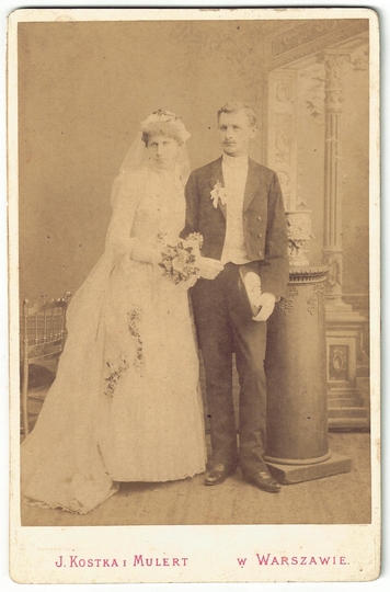 Henryk Sikorski z żoną Eleonorą z Jaworowskich - kuzyn pisarza, syn siostry ojca pisarza Marii - fotografia ślubna - portretowa, pozowana - ujęcie w formacie gabinetowym - z lat. 80. XIX w. wykonana przez atelier J. Kostki i Mulerta w Warszawie.