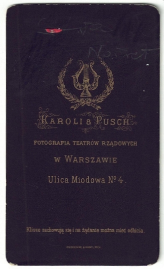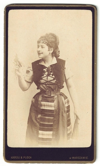 Zofia Noiret - aktorka i przyjaciółka pisarza - fotografia portretowa - ujęcie w formacie card de visite - z 1884 (?), wykonana przez atelier [Aleksandra] Karoli & [Maurycego] Pusch w Warszawie.