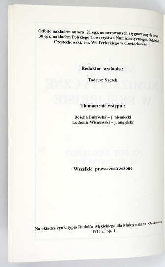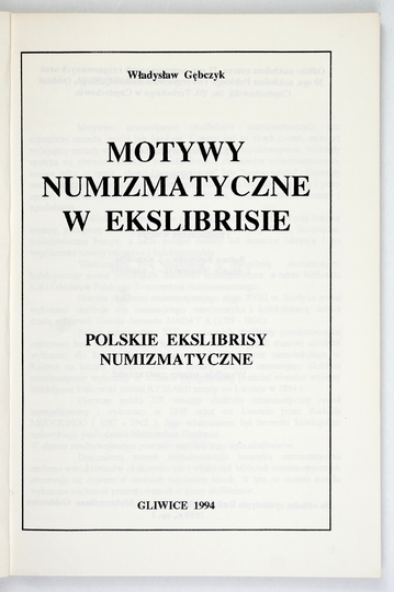 GĘBCZYK Władysław – Motywy numizmatyczne w ekslibrisie. Polskie ekslibrisy numizmatyczne. Gliwice 1994. Nakł. autora i Pol. Tow. Numizmatycznego, Oddz. Częstochowskiego. 4, s. 183, [4]. brosz.