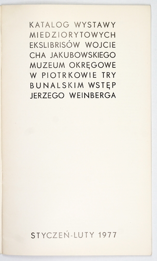 [JAKUBOWSKI Wojciech]. Katalog wystawy miedziorytowych ekslibrisów Wojciecha Jakubowskiego. Wstęp Jerzego Weinberga. Piotrków Trybunalski, I-II 1977. Muzeum Okręgowe. 4, s. [24]. brosz.