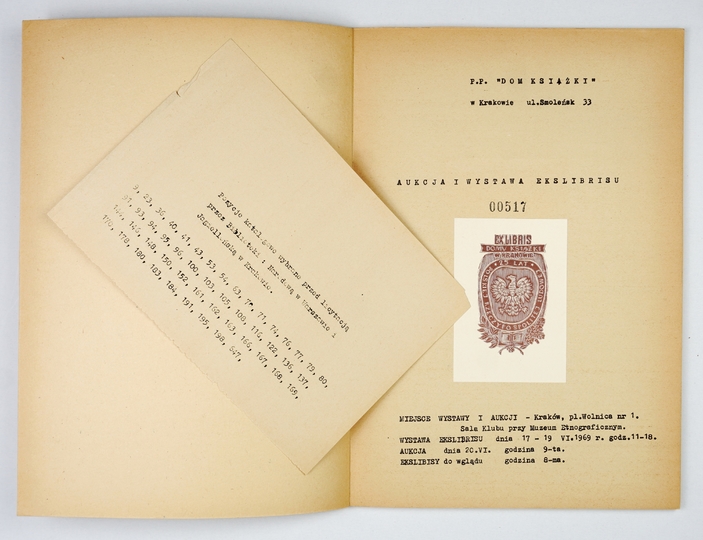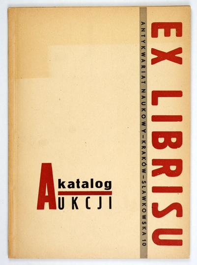 [KATALOG aukcyjny]. Aukcja i wystawa ekslibrisu. Kraków, VI 1969. P.P. "Dom Książki" w Krakowie, Antykwariat Naukowy Sławkowska 10. 4, s. [6], 55. brosz.