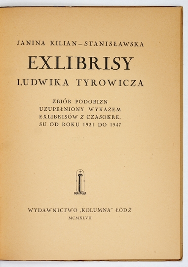 KILIAN-STANISŁAWSKA Janina – Exlibrisy Ludwika Tyrowicza. Zbiór podobizn uzupełniony wykazem exlibrisów z czasokresu od roku 1931 do 1947. Łódź 1947. Wyd. "Kolumna". 4, s. 30, [1], tabl. 1. brosz.