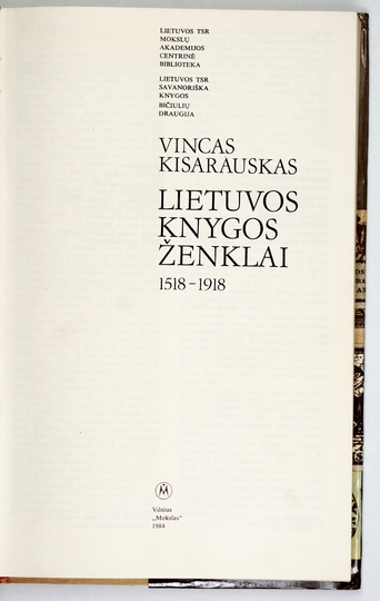 KISARAUSKAS Vincas – Lietuvos knygos ženklai 1518-1918. Vilnius 1984. Mokslas. 4, s. 219, [5]. opr. oryg. pł., obw.