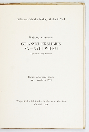KURKOWA Alicja – Katalog wystawy Gdański Ekslibris XV-XVII wieku. Oprac. ... Gdańsk 1978. Wojew. Biblioteka Publiczna. 8, s. 40, [7], tabl. 60. brosz. obw.
