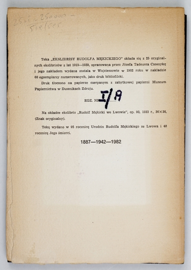 [MĘKICKI Rudolf]. Ekslibrisy Rudolfa Mękickiego. Wojcieszów 1982. Nakł. J. T. Czosnyki. 8, s. [4], tabl. 25. oryg. teka kart.