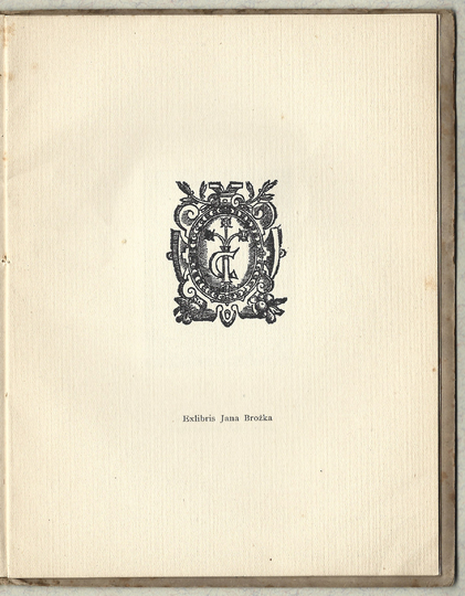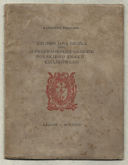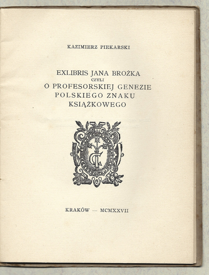 PIEKARSKI Kazimierz – Exlibris Jana Brożka czyli o profesorskiej genezie polskiego znaku książkowego. Kraków 1927. Druk. W. L. Anczyca. 16d, s. 18, [3], tabl. 4. brosz. Odb. z "Silva Rerum".