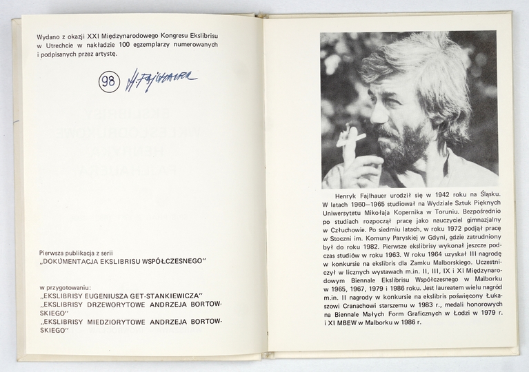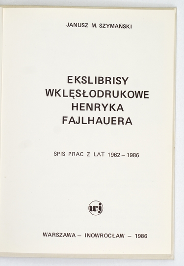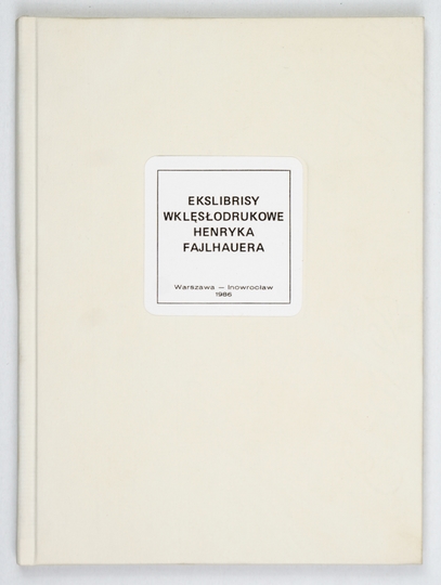 SZYMAŃSKI Janusz M. – Ekslibrisy wklęsłodrukowe Henryka Fajlhauera. Spis prac z lat 1962-1986. Warszawa-Inowrocław 1986. WJ. 16d, s. [24], tabl. 6. opr. oryg. kart.
