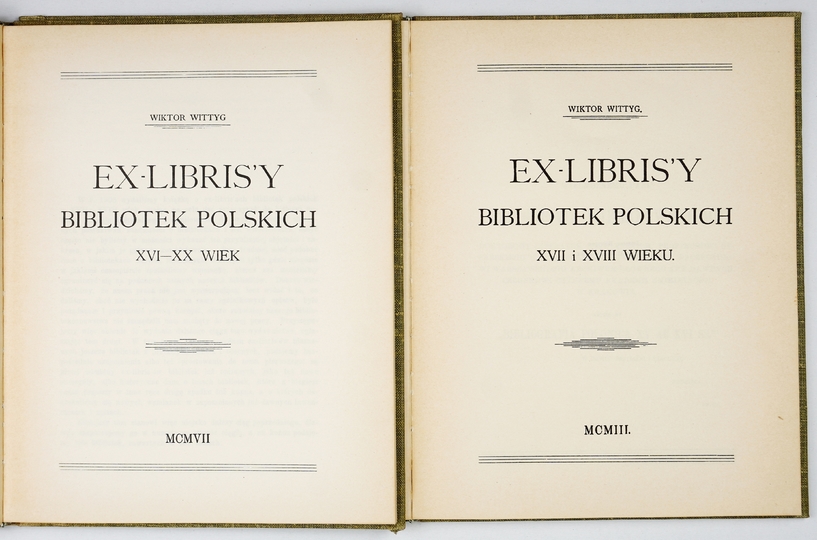 WITTYG Wiktor – Ex-librisy bibliotek polskich XVII i XVIII wieku [oraz współwyd.] Ex-librisy bibliotek polskich, XVI-XX wiek. Warszawa 1974. Wyd. Artystyczne i Filmowe. 4, s. [4], 96, [4]; [6], 97-194, [8]. opr. oryg. pł.