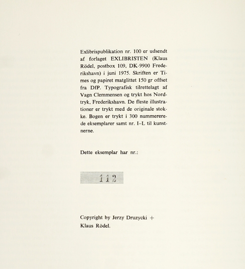 DRUZYCKI Jerzy – Det moderne polske exlibris. Frederikshavn 1974. Exlibristen. 4, s. 105, [1]. opr. oryg. pł., obw. Det europaeiske exlibris efter 1950, vol. 1.