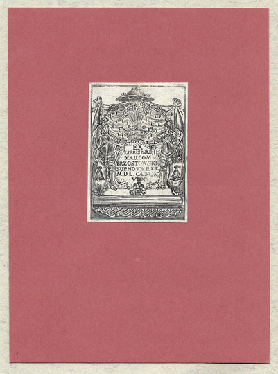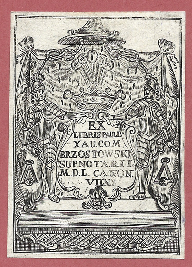 [BRZOSTOWSKI Paweł Ksawery]. Ex libris Pauli Xav[erii] Brzostowski Sup[remi] Notarii M[agni] D[ucatis] L[ithuaniae] Canon[ici] Viln[ensi].