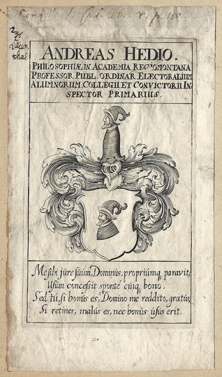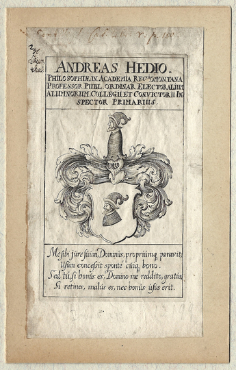 [HEDIUS Andrzej]. Andreas Hedio. Philosophiae in Academia Regiomontana Professor Publ. Ordinar. Electoralium Alumnorum Collegii et Convictorii Inspector Primarius.