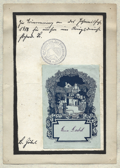 [LOŻA wolnomularska]. Karta z książki ze ślepym ekslibrisem z wpisanym nazwiskiem "Lena Goebel", jej podpisem, wpisem okolicznościowym i okrągłą pieczęcią z symboliką masońską: "Johannis-Loge 'Carl Wiebe zum ewigen Licht'".