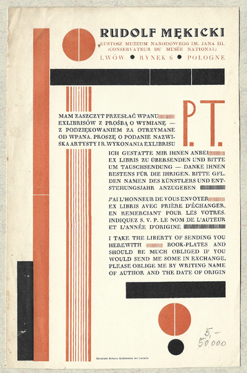 MĘKICKI Rudolf (1887-1942) – Typograficzny list Rudolfa Mękickiego w czterech językach proponujący wymianę ekslibrisów.