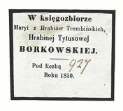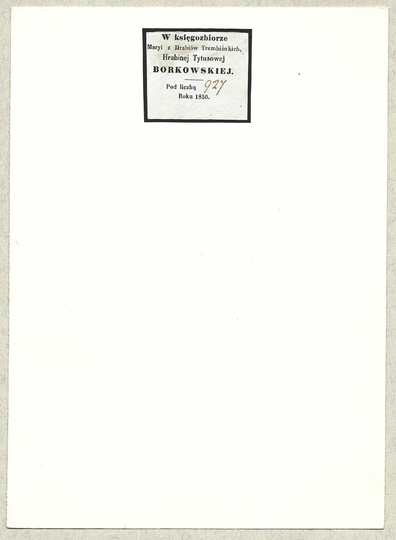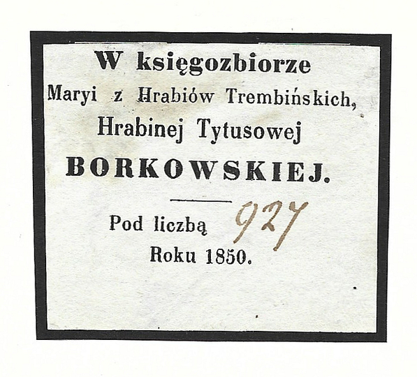 [BORKOWSKA Maria]. W księgozbiorze Maryi z Hrabiów Trembińskich Hrabinej Tytusowej Borkowskiej. Roku 1850.
