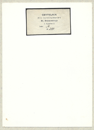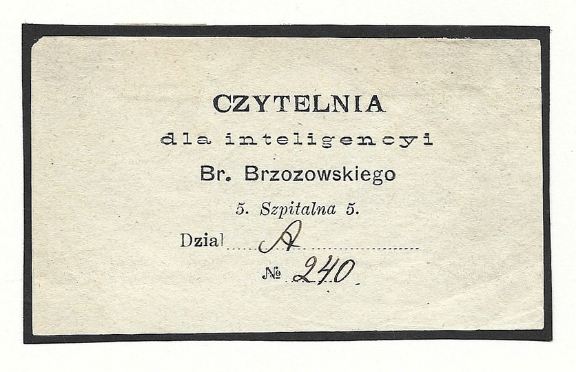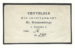 [BRZOZOWSKI Bronisław]. Czytelnia dla inteligencyi Br. Brzozowskiego, 5. Szpitalna 5.