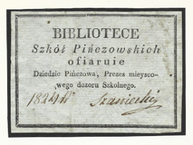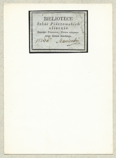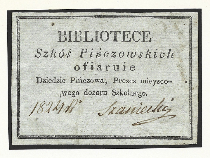 [SZKOŁY Pińczowskie]. Bibliotece Szkół Pińczowskich ofiaruie Dziedzic Pińczowa, Prezes mieyscowego dozoru Szkolnego.