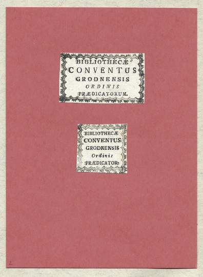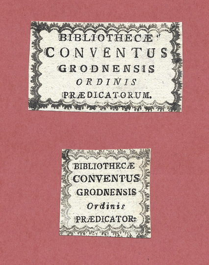 [BIBLIOTEKA Dominikanów w Grodnie]. Bibliothecae Conventus Grodnensis Ordinis Praedicatorum. [2 różne ekslibrisy].