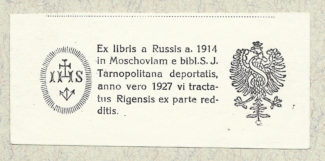 [KOLEGIUM Jezuickie w Tarnopolu]. Ex libris a Russis a.1914 in Moschoviam e bibl. S. J. Tarnopolitana deportatis, anno vero 1927 vi tractatus Rigensis ex parte redditis.
