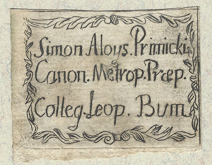 [PRIMICKI Szymon Alojzy]. Simon Aloys. Primicki Canon. Metrop. Praep. Colleg. Leop. Bum.