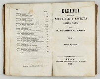 BALICKI Wincenty – Kazania na wszystkie niedziele i święta całego roku. Drugie wydanie. T. 1-2 (w 1 wol.). Lwów 1853. Nakł. Franciszka Pillera i Sp. 8, s. XI, [4], 316; 412. razem zbrosz.