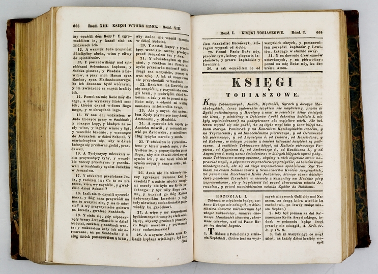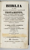 [BIBLIA. Stary Testament] Biblia to iest księgi Starego i Nowego Testamentu, według łacińskiego przekładu starego, w Kościele Powszechnym przyiętego, na polski ięzyk znowu z pilnośćią [!] przełożone [...] przedtym przez D. Jakuba Wuyka z Wągrowca [...] wydane w Krakowie 1599, teraz [...] przedrukowane. Lwów 1840. Bartłomiej Jabłoński i Syn. 8, s. 1468, III. opr. psk. z epoki.