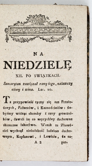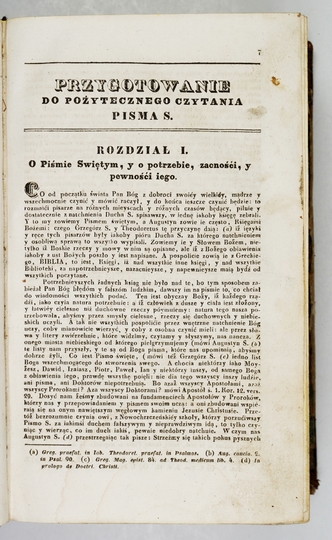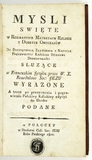 BOURDALOUE [Louis] – Mysli swięte w rozmaitych materyach religii y dobrych obyczajów do dostąpienia zbawienia y nabycia przyzwoitey każdego stanowi doskonałości słuzące. W francuzkim języku [...] wyrazone a teraz po przeyrzeniu i poprawieniu polskiey kaliskiey edycyi do druku podane. [T. 1]. Połock 1801. Druk. Coll: Soc: Jesu. 16d, s. [6], 547, [3]. opr. skóra z epoki.