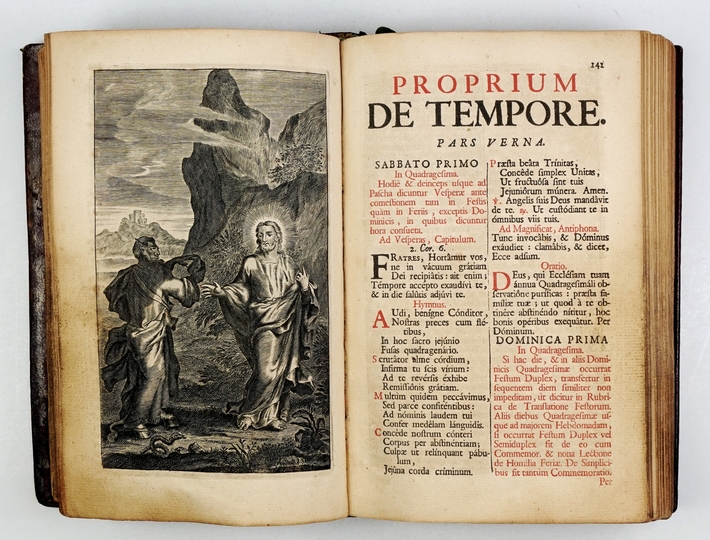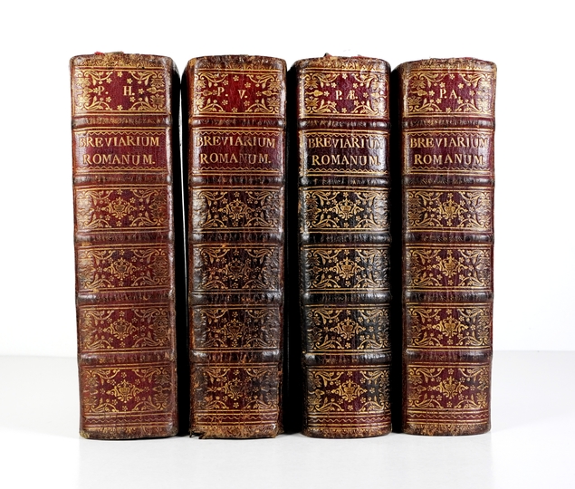 BREVIARIUM Romanum Ex decreto Sacro-Sancti Concilii Tridentini restitutum. S. PII V. Pontificis Maximi Jussu editum, Clementis VIII [...] Urbani PP. VIII. Auctoritate recognitum. In quo omnia fuis locis ad longum profita funt, pro majori recitantium commoditate. T. 1-4 (Pars Verna, Aestiva, Autumnalis, Hiemalis). Antverpiae 1764. Ex Architypographia Plantiniana. 8, s. [32], 572, CCXXXJ, [5]; [32], 592, CCIV, [6], [32], 524, CCL, [6]; [56], 560, CCXXVIII, [4], 8, [2]. opr. oryg. skóra złoc.