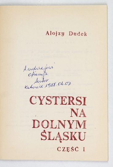 DUDEK Alojzy – Cystersi na Dolnym Śląsku. Cz. 1-3. Wrocław 1988. [b. w.]. 8, s. 48; [7], 52-107, [9]; [7], 112-171. brosz.