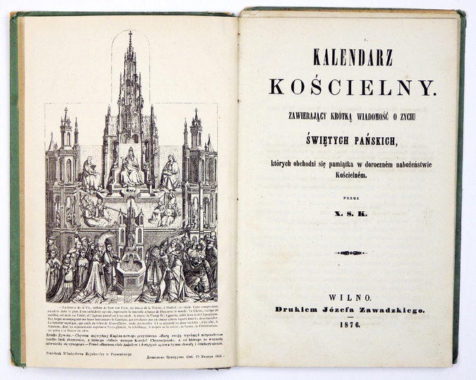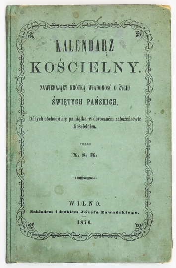 [KOZŁOWSKI Szymon] – Kalendarz kościelny. Zawierający krótką wiadomość o zyciu świętych Pańskich, których obchodzi się pamiątka w dorocznem nabożeństwie Kościelnem. Przez X. S. K. [krypt.]. Wilno 1876. Druk. J. Zawadzkiego. 8, s. IX, [1], 62, tabl. 2. opr. oryg. kart.