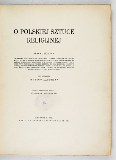 LANGMAN Jerzy – O polskiej sztuce religijnej. Praca zbiorowa [...] pod red. ... Inicjały drzeworyty wykonał Stanisław Jakubowski. Katowice 1932. Związek Artystów Śląskich. 4, s. 383, tabl. 8. brosz.