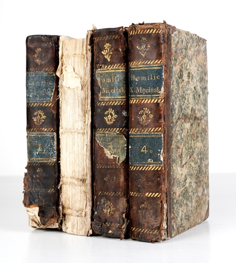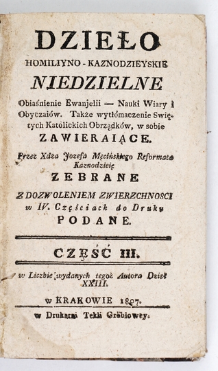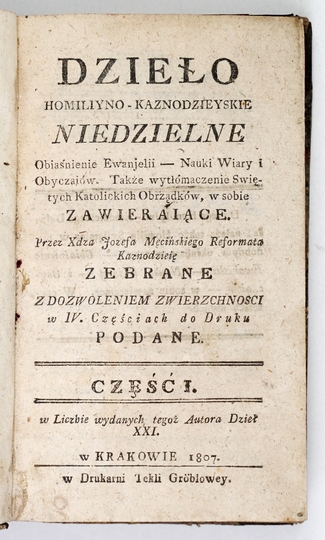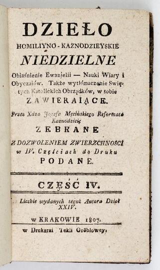 MĘCIŃSKI Józef – Dzieło homiliyno-kaznodzieyskie niedzielne. Objaśnienie Ewanjelii, nauki wiary i obyczaiów, także wytłómaczenie świętych katolickich obrzędów w sobie zawieraiące: w 4 częściach do druku podane. Cz. 1-4. Kraków 1807. W Drukarni Tekli Groblowey. 16d, s. [8], 418, [9]; 408, [8]; 406, [9]; 399, [6] opr. psk. z epoki.