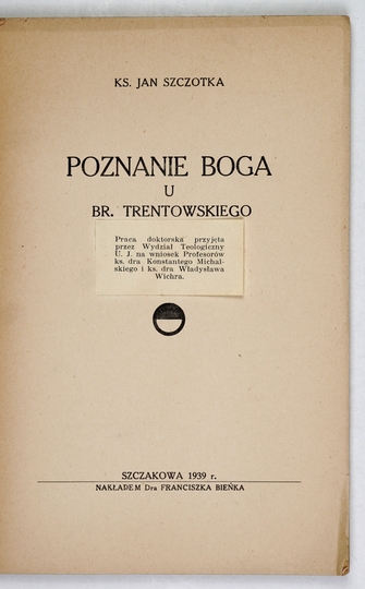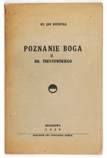 SZCZOTKA Jan – Poznanie Boga u Br. Trentowskiego. Szczakowa 1939. Nakł. Franciszka Bieńka. 8, s. 85, [1]. brosz.