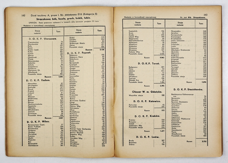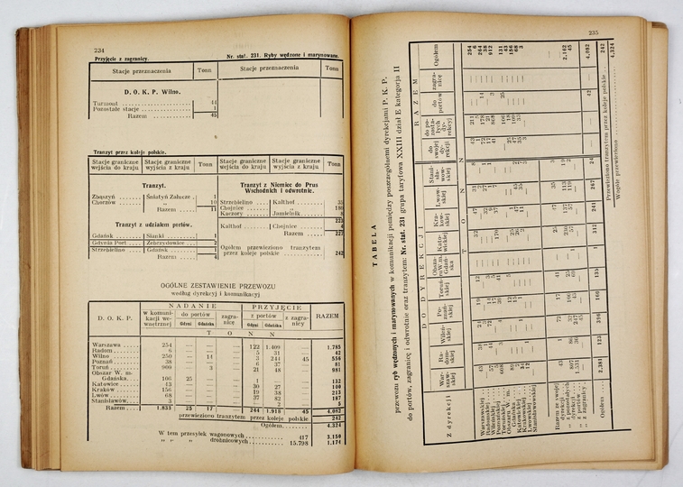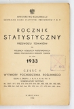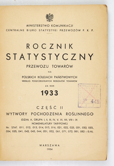 ROCZNIK statystyczny przewozu towarów na Polskich Kolejach Państwowych za rok 1933. Cz. 2: Wytwory pochodzenia roślinnego [...]. Warszawa 1934. Ministerstwo Komunikacji, Centralne Biuro Statystyki Przewozów P. K.P. 8, s. VIII, 423. brosz.